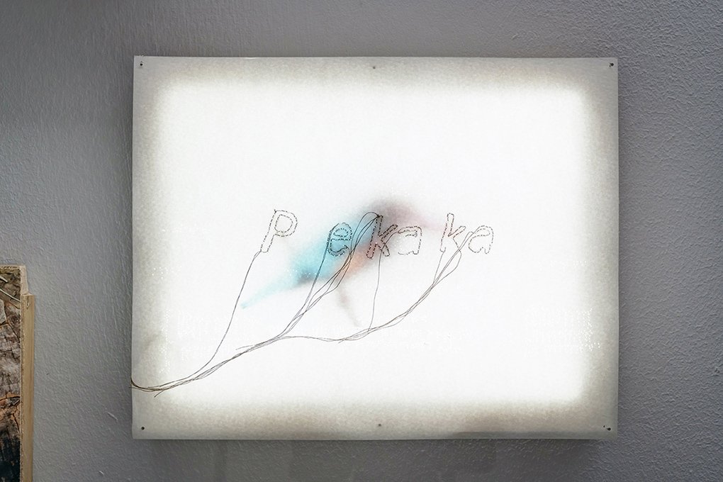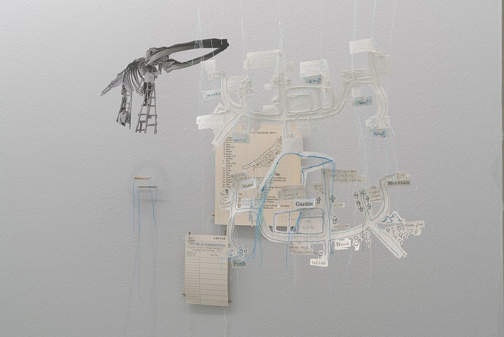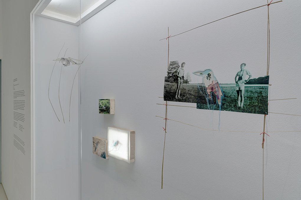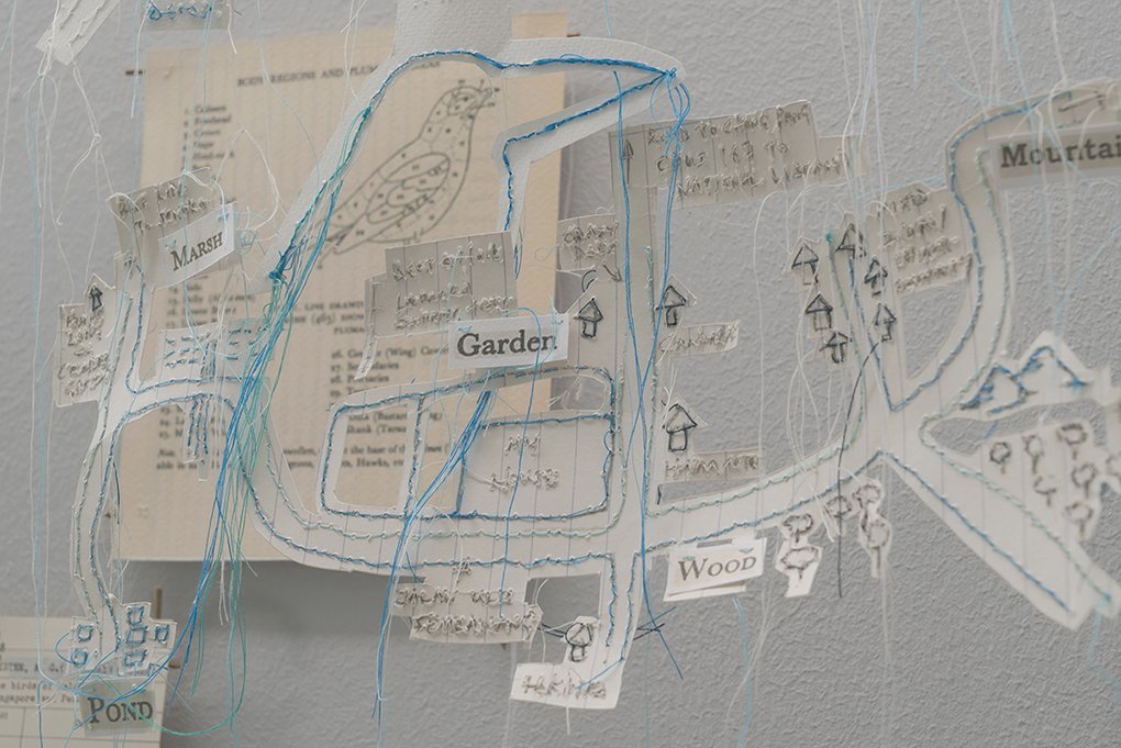 The mixed-media selection presented in The Vitrine stems from Railtrack Songmaps, a project exploring competing claims to nature and culture that resound along the former Malaysian railway tracks at Tanglin Halt. For at least five decades, birds, nature lovers, songbird clubs, tree shrines, kampung gardeners and foragers have roosted and seeded themselves along the tracks, nurturing a tangled patch of urban wild that is currently undergoing redevelopment. The particular constellation of elements on display – photographs, Malay pantuns, embroidery on paper, and delicate airborne assemblages of images, cut-outs and coconut sticks – weave in and out of memories of Lim Kim Seng, who together with his brother Lim Kim Chua, joined the Nature Society of Singapore (NSS) as teenager. Both are now senior members of the NSS Bird Group. Kim Seng assisted The Migrant Ecologies Project in the identification of 105 bird species around Tanglin Halt. In an accompanying soundtrack he recalls how an early encounter with a kingfisher first drew him into a bird zone.