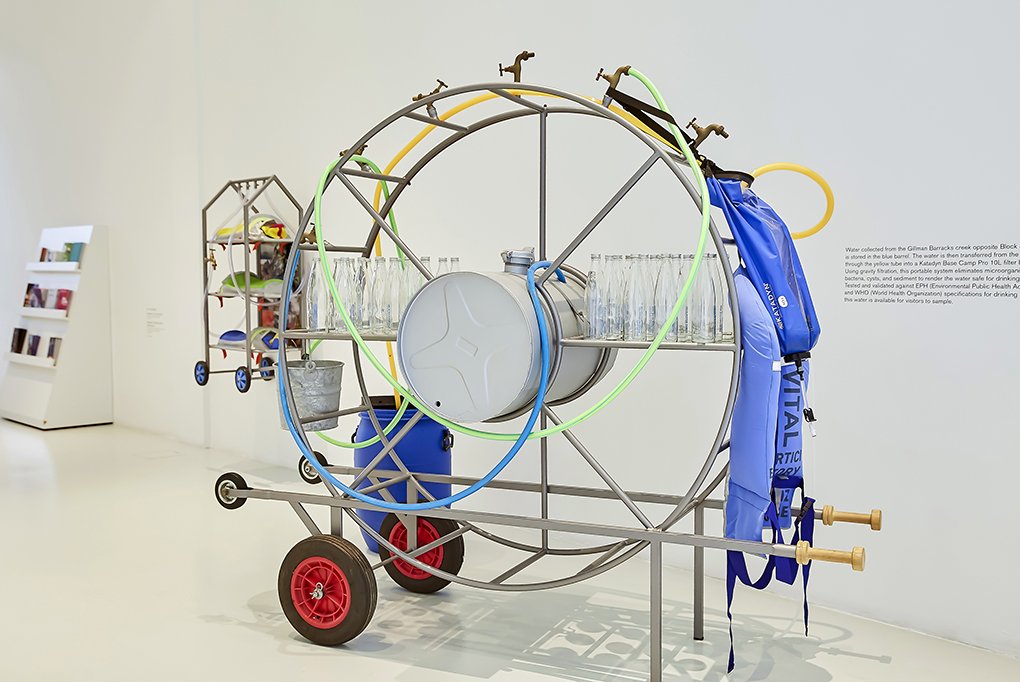 Stressing the vital importance of clean water and the challenges of its scarcity around the world, the artist and design duo Lucy + Jorge Orta have developed a long-term project on water collection, purification, and distribution. OrtaWater focuses on the general issues surrounding clean water and the privatisation and corporate control effecting access to it. Starting from a rigorous analysis of this crucial resource through visual and textual research and collaborative workshops with engineers, Lucy + Jorge Orta create sculptures, large-scale installations, and public artworks, that are both artefacts and functional design. One angle of their research—low-cost water purification devices enabling filthy water to be pumped and filtered directly from local sources—is translated into Portable Water Fountain (2005) and Mobile Intervention Unit (2007). These devices have been used to purify and distribute water from the Venice’s Canal Grande (2005) and the Huang Pu River in Shanghai (2012), among others, and now from the creek that runs through Gillman Barracks.