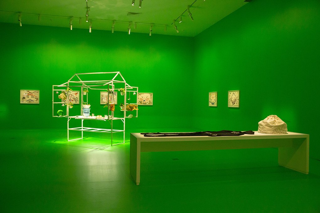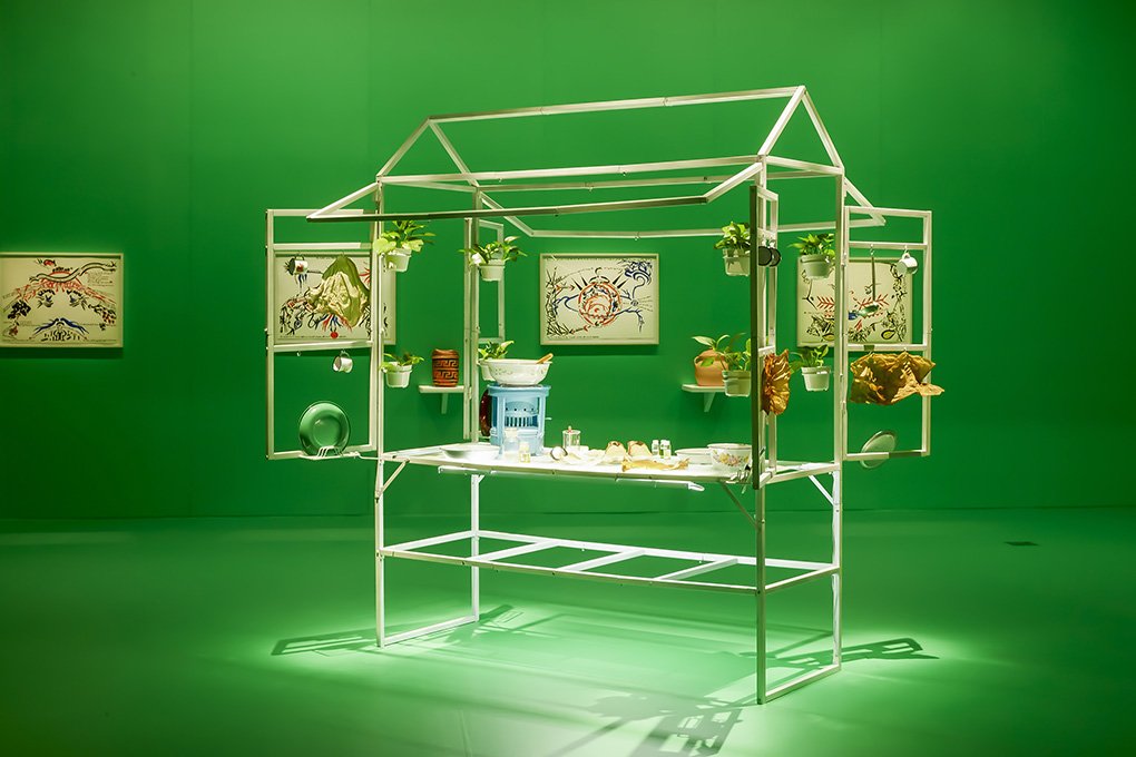 Similarly combating water pollution, Irene Agrivina’s Soya C(o)u(l)ture is a mixed media installation that demonstrates how to transform wastewater from tofu and tempeh production into usable biomaterials, such as fuel, fertiliser, and leather-like fabrics. Soya C(o)u(l)ture was developed in collaboration with XXLab, an all-female transdisciplinary collective that Agrivina co-founded. Usually, large amounts of wastewater pollute the water in the rivers surrounding the plants, which in turn causes cholera and skin and bowel diseases in humans. Soya C(o)u(l)ture intends to divert this wastewater from tofu factories and put it in a homegrown starter culture medium to create useful products. A biological process using various bacteria and cell cultures, for instance Acetobacter xylinum, generates alternative energy sources, foodstuffs, and biological material. This process creates cellulose sheets that can either be used for consumption—nata de coco, a variant made of coconut water, is a popular snack food—or further processed (pressed, dried, enhanced with colouring and coating) to make clothing and craft materials. This biological procedure can be reproduced in any household using normal kitchen utensils in combination with open-source software and simple hardware. In this way, the project could provide women in poverty-stricken regions with opportunities to increase their income.