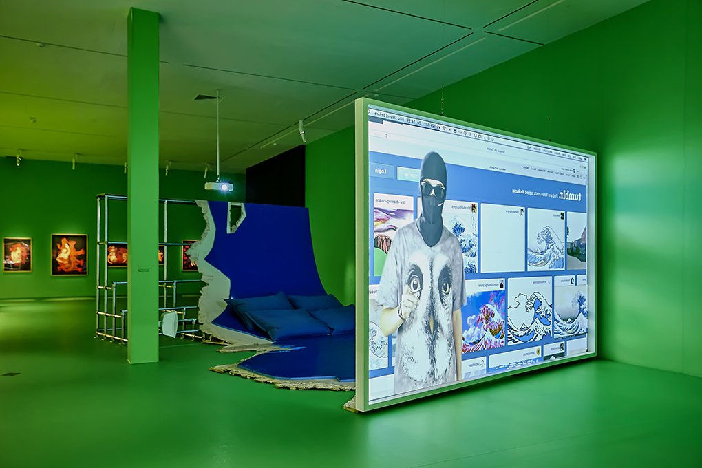A parable on economic crashes, financial trading, mixed martial arts, and general contemporary culture, artist and writer Hito Steyerl’s large-scale architectural environment features Liquidity Inc., a single-screen projection that uses water and liquidity as guiding tropes. Opening with the quote “be water, my friend” by martial arts legend and actor Bruce Lee, the film comments on the circulation of digital images, big data, information, financial assets, labour, and weather systems. The installation consists of a double-sided projection screen in front of a blue, wave-like ramp, where the viewers find themselves in “troubled water.” Steyerl merges CGI and green screen scenes with an assortment of embedded videos, swipes, clips, scrolls, and pop-up windows, that include the story of Jacob Wood, a former financial analyst who lost his job during the 2008 economic recession and decided to turn his mixed martial arts hobby into a new career. The intricate mesh of late capitalism structures needs to be hijacked in order to allow space for new ecological and sustainable policies that value people and life over profit.