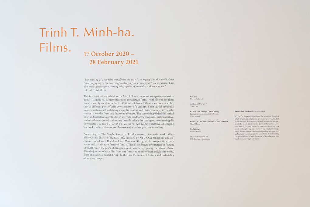 Through Trinh T. Minh-ha. Writings., a display of Trinh’s books on reading platforms along the passageway connecting the five theatres in The Exhibition Hall, as well as Why are they so afraid of a lotus?, presented in The Lab by CCA Wattis Institute for Contemporary Arts (Wattis), San Francisco, that showcases its year-long research season on her multifaceted practice, viewers are able to encounter her extensive writing that is core to her practice.