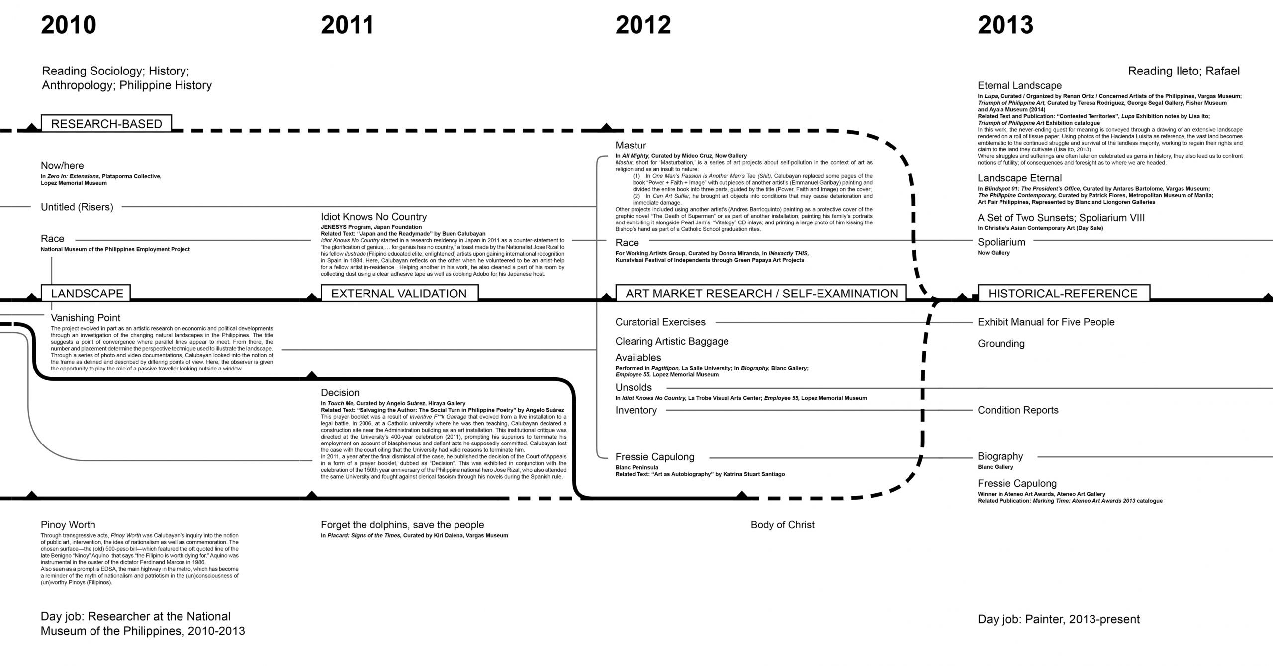 Illustrating a new way of seeing, Buen Calubayan’s Instructions on Viewing the Landscape is an long-term exercise in seeing the bigger picture, literally and figuratively, which subtly challenges notions of national identity and colonialism. Articulated through a complex set of rules, this conceptual work is an investigative device aimed to unpack the history of late 19th century Filipino art – a period of significant political changes propelled by the revolutions against the Spanish rule. In re-examining and reviewing the landscapes of celebrated painters Juan Luna (1857 – 1899) and Félix Resurrección Hidalgo (1855 – 1913), the artist locates their vanishing points and brings to the fore unexpected tensions between the viewer and the artwork. Over the course of his residency, Calubayan will extend the scope of the project in order to pinpoint the metaphorical vanishing points in Singapore’s landscape, locating their historical, economic, and religious coordinates.