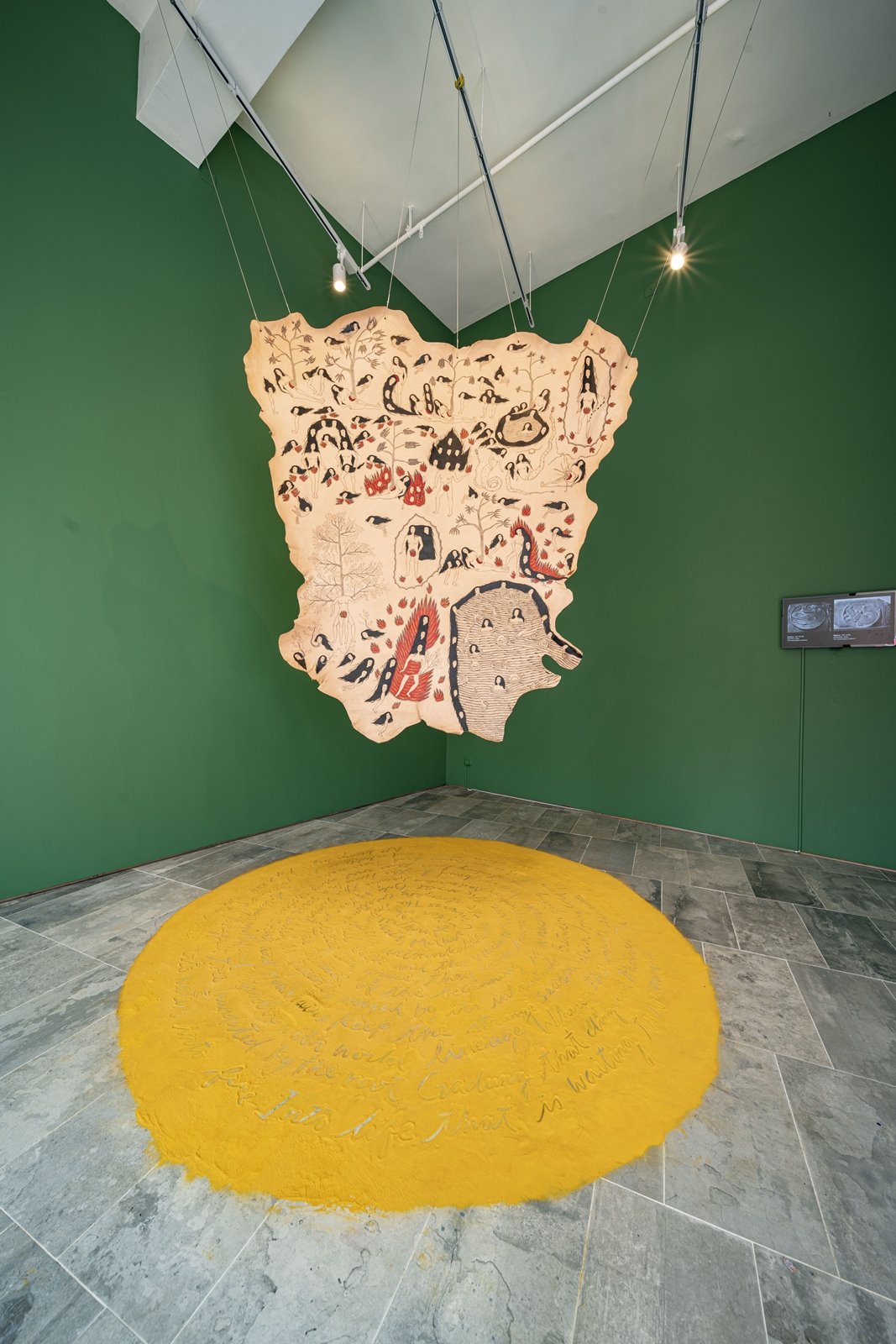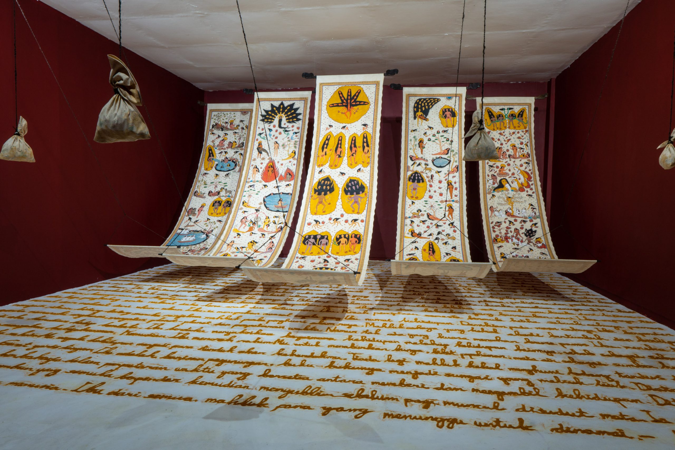 Timur Merah Project: The Embrace of My Motherland, 2019, 5 paintings 90 X 400 cm each, turmeric powder text. Courtesy the artist