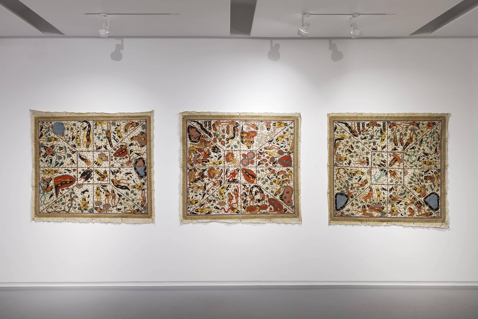 Timur Merah Project VI : Tidings of the Heavens, Timur Merah Project VI : Into the Land of Beast-God and Timur Merah Project VI: Valley of Eternal Fire. All 2021, acrylic on Kamasan canvas, 155 X 145 CM. Courtesy of the artist.